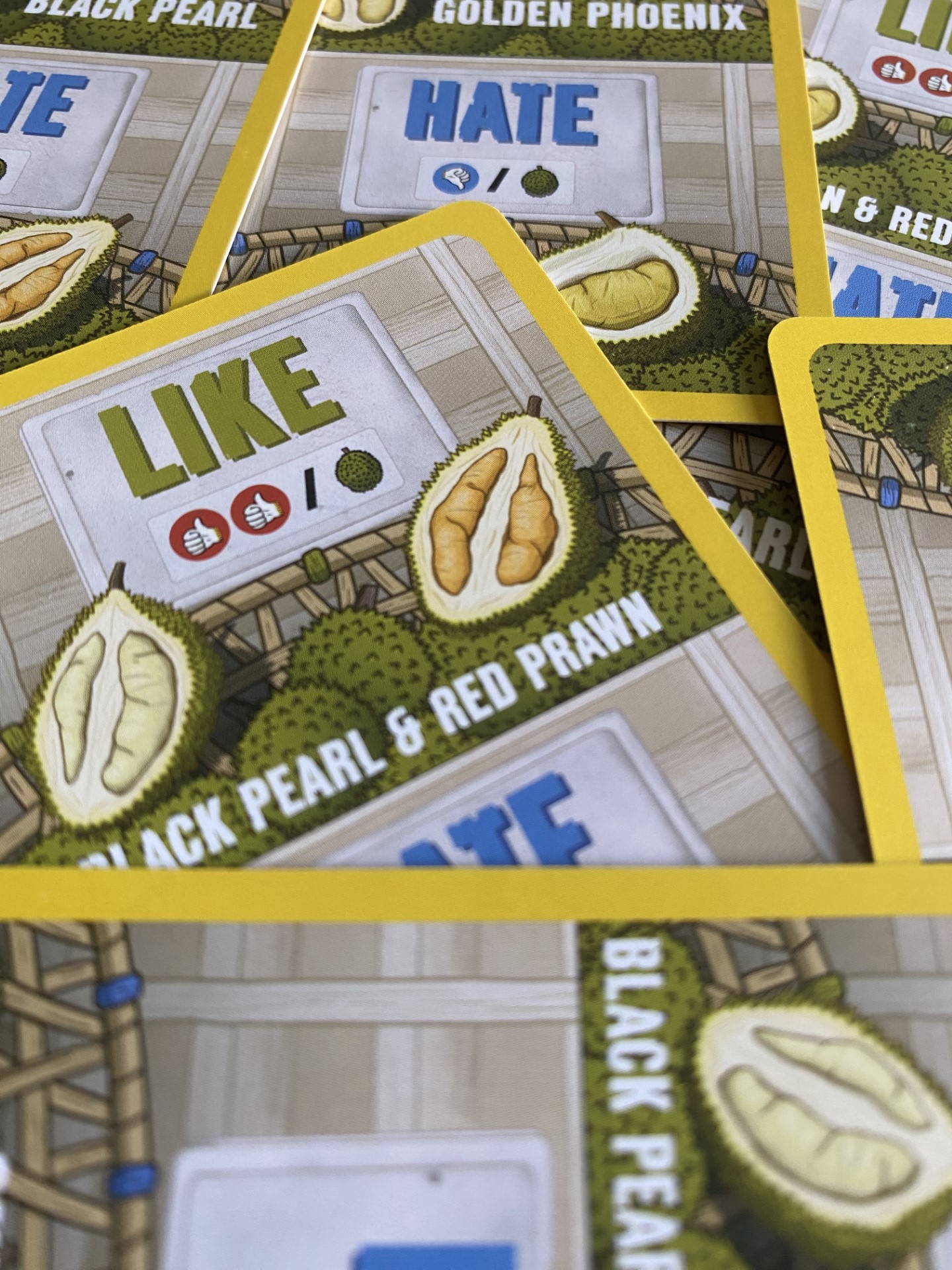 The art work in this game isn’t particularly eyecatching once you get past the huge abundance of yellow on offer. There’s not a vast array of difference from one durian to the next, aside from the number of stones in each fruit. Each durian type has a different coloured border and identification text but it can get lost in the sea of yellow cards. It wasn’t too much of a problem in a two-player game but with six players there’ll be an awful lot of durians in play and I think it’d be a little bit harder to pick out the ones you want. But then, simplistic artwork for a simple game works brilliantly in things like Point Salad, so it’s not all bad.