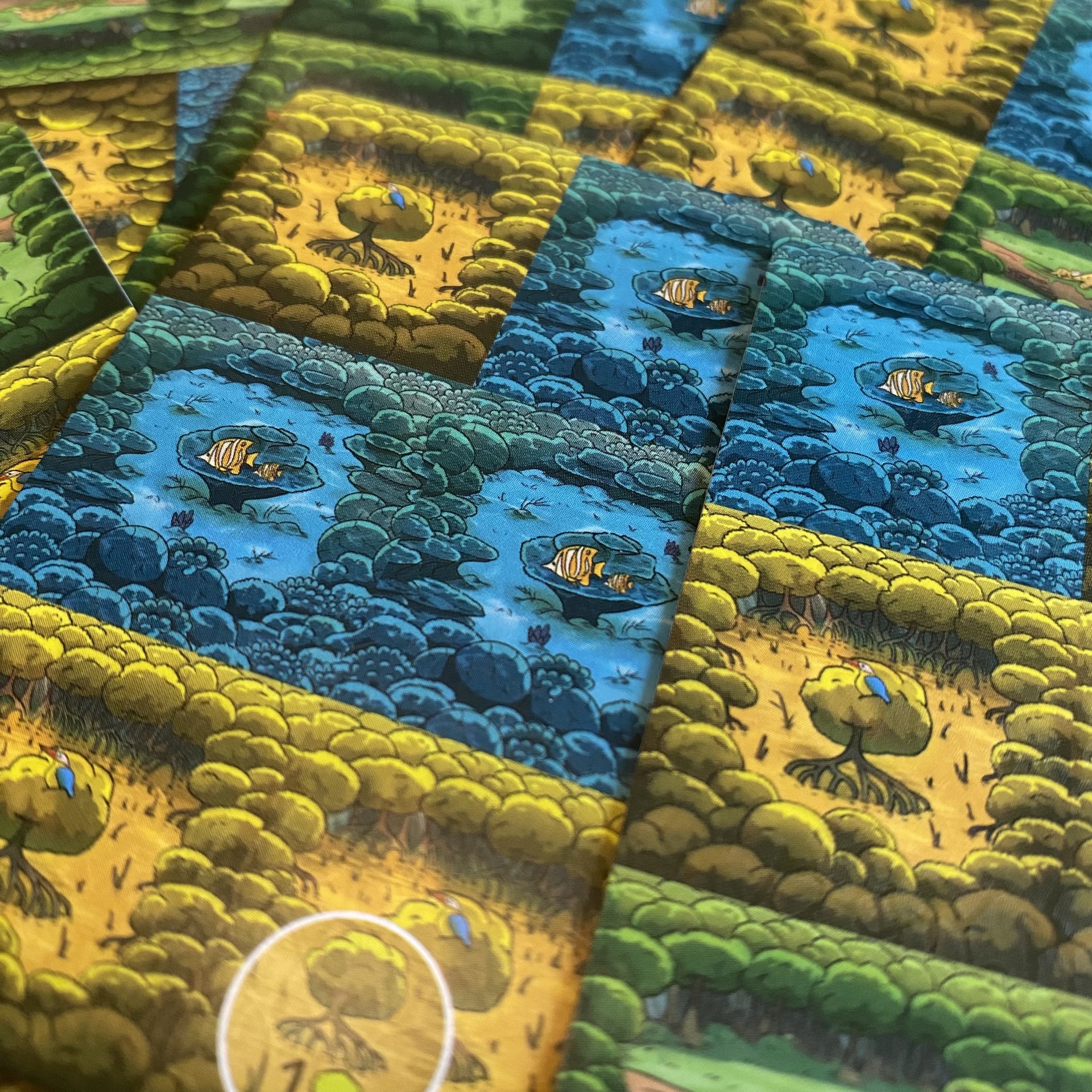 The artwork throughout the game is eye-catchingly colourful. Both the habitat cards and wildlife tokens are beautiful, it’s just a shame that so much of the habitat is covered by the tokens. I feel like the habitat cards should be about twenty-five percent bigger to better accommodate the tokens and make everything feel less fiddly.