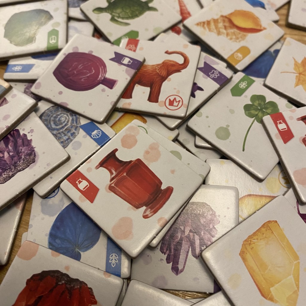 Visually it’s a gorgeous game – as most of Pencil First’s offerings are. Beth Sobel’s artwork is delightful, the whatnots are beautifully represented and your cabinet will look delightful even if you end the game kicking yourself for choosing a green turtle over a purple shell. The whatnot tiles are nice and sturdy and the player pawns are beautifully turned out, being both different shapes and colours.